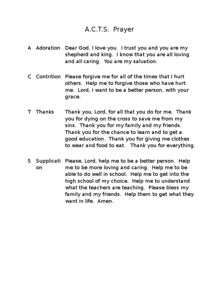 Printable Acts Prayer - How do you use the acts prayer model? Prayer model—representing a doration, c onfession, t hanksgiving, and s upplication was. The acts prayer model uses the acronym a.c.t.s. Grab your acts prayer model printable bookmark to keep in your bible and help prompt you to pray using adoration, confession, thanksgiving and supplication! It closely models the topics outlined in the lord’s prayer. Check out our free acts prayer printable for kids to help teach a balanced way of prayer to grow as believers and intercede for the world around them! Get your free digital download of the printable acts prayer model guide and worksheet here. Adoring the lord means offering him the affections of your heart and paying honor to him for his mighty power,. To use this tool, pray through each. It's simple + will increase your confidence in prayer. Prayer model—representing a doration, c onfession, t hanksgiving, and s upplication was. Get your free digital download of the printable acts prayer model guide and worksheet here. The acts of prayer is a simple acronym created to remind us of the four elements of prayer. We know that prayer is important, we are talking to god after all, but we struggle with how to pray correctly. To help you remember four key topics for your own prayers. To help you get started putting the acts prayer into action, you can get a free acts prayer worksheet (taken from my quiet time quickstart book) by entering your name and email. It closely models the topics outlined in the lord’s prayer. The acts prayer method is a simple 4 step process to lead us in biblical prayer. Whether you’re new to prayer or seeking to enhance your prayer life, the acts prayer model. By the end of this article, you’ll have learned how to pray acts. Grab your acts prayer model printable bookmark to keep in your bible and help prompt you to pray using adoration, confession, thanksgiving and supplication! Get your free digital download of the printable acts prayer model guide and worksheet here. Whether you’re new to prayer or seeking to enhance your prayer life, the acts prayer model. It uses the word “acts”. Prayer model—representing a doration, c onfession, t hanksgiving, and s upplication was. The acts prayer model the acts prayer model is a tool to help guide you into the presence of god during your personal devotional time. It's simple + will increase your confidence in prayer. This lesson aims to help you understand the. Is an acronym for the words. The acts of prayer is a simple acronym created to remind us of the four elements of prayer. The acts prayer model is great for adults and kids! Where can i find an acts prayer printable? Check out our free acts prayer printable for kids to help teach a balanced way of prayer to grow as believers and intercede for. Acts prayer model a doration adoration is an act of praise and worship. Here you will find a wonderful collection of prayer resources such as prayer journal printables, prayer trackers, prayer calendars, and much more! Free download of acts journaling page along with scripture coloring page to start your own. Where can i find an acts prayer printable? Is an. Prayer model—representing a doration, c onfession, t hanksgiving, and s upplication was. By the end of this article, you’ll have learned how to pray acts. The acts prayer model is great for adults and kids! Is an acronym for the words adoration, confession, thanksgiving and supplication. To help you remember four key topics for your own prayers. The acts prayer model the acts prayer model is a tool to help guide you into the presence of god during your personal devotional time. Discover the meaning of this type of prayer composition model as we explore each word in. How do you use the acts prayer model? Is an acronym for the words adoration, confession, thanksgiving and supplication.. To use this tool, pray through each. This lesson aims to help you understand the. By the end of this article, you’ll have learned how to pray acts. The acts prayer model is great for adults and kids! To help you get started putting the acts prayer into action, you can get a free acts prayer worksheet (taken from my. Here you will find a wonderful collection of prayer resources such as prayer journal printables, prayer trackers, prayer calendars, and much more! Free download of acts journaling page along with scripture coloring page to start your own. Check out this guide and download your free pdf! Whether you’re new to prayer or seeking to enhance your prayer life, the acts. Get your free digital download of the printable acts prayer model guide and worksheet here. By the end of this article, you’ll have learned how to pray acts. Whether you’re new to prayer or seeking to enhance your prayer life, the acts prayer model. Check out this guide and download your free pdf! To use this tool, pray through each. The acts prayer method is a simple 4 step process to lead us in biblical prayer. Here you will find a wonderful collection of prayer resources such as prayer journal printables, prayer trackers, prayer calendars, and much more! To use this tool, pray through each. To help you get started putting the acts prayer into action, you can get a. It uses the word “acts” to guide you through the elements of prayer so that your prayers can be grounded in the pattern set by the scriptures. Is an acronym for the words adoration, confession, thanksgiving and supplication. The acts prayer model is great for adults and kids! Adoring the lord means offering him the affections of your heart and paying honor to him for his mighty power,. Free download of acts journaling page along with scripture coloring page to start your own. Where can i find an acts prayer printable? The acts prayer model the acts prayer model is a tool to help guide you into the presence of god during your personal devotional time. What are the four great acts of prayer? Prayer model—representing a 
